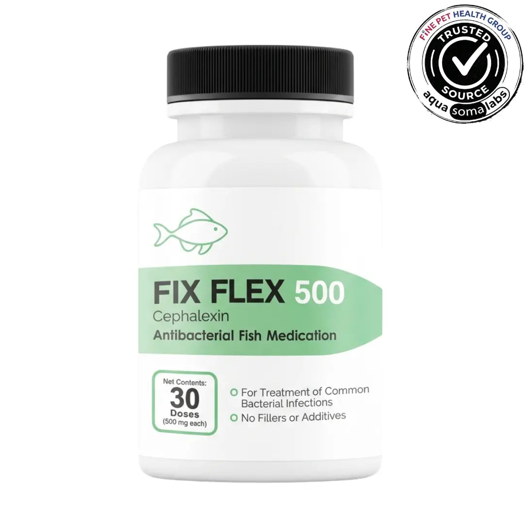 Fix Flex (often called Fish Flex in the hobby community) is a convenient cephalexin fish antibiotic in capsule form for ornamental aquarium fish and non-food pet birds. This fish and bird antibiotic helps manage common bacterial issues such as fin and tail rot, skin ulcers, red patches and mild body swelling in freshwater and saltwater aquariums. The capsules can be opened so the powder dissolves quickly and the dose spreads evenly through the water or a separate hospital tank.