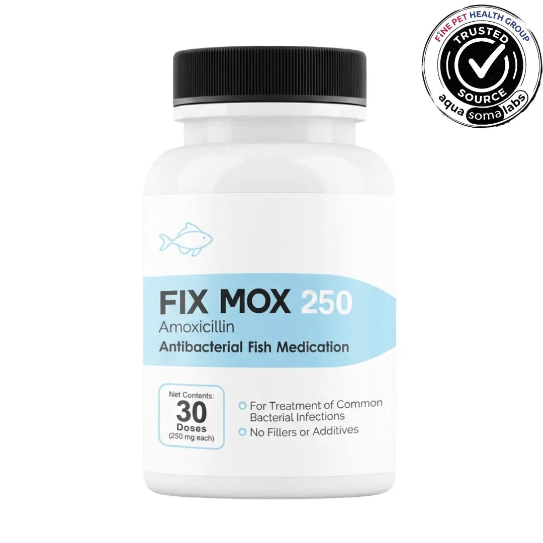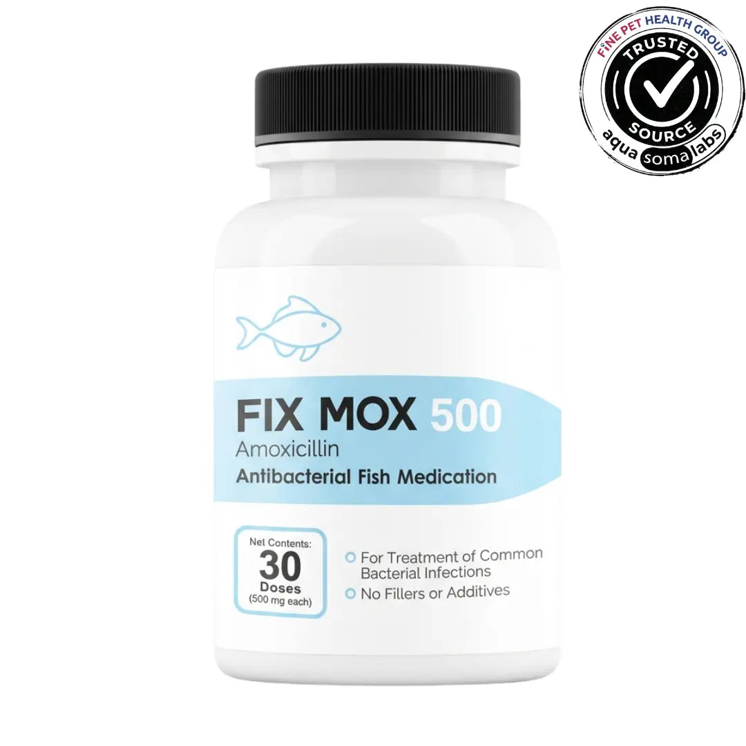 Fix Mox (amoxicillin 250 mg / 500 mg) is a fish and bird antibiotic used by hobbyists to help manage bacterial issues such as dropsy (body swelling), fin and tail rot, red streaks, pop-eye, skin ulcers and certain gill infections in ornamental fish, and to support veterinarian-directed treatment plans for selected bacterial problems in non-food pet birds.
