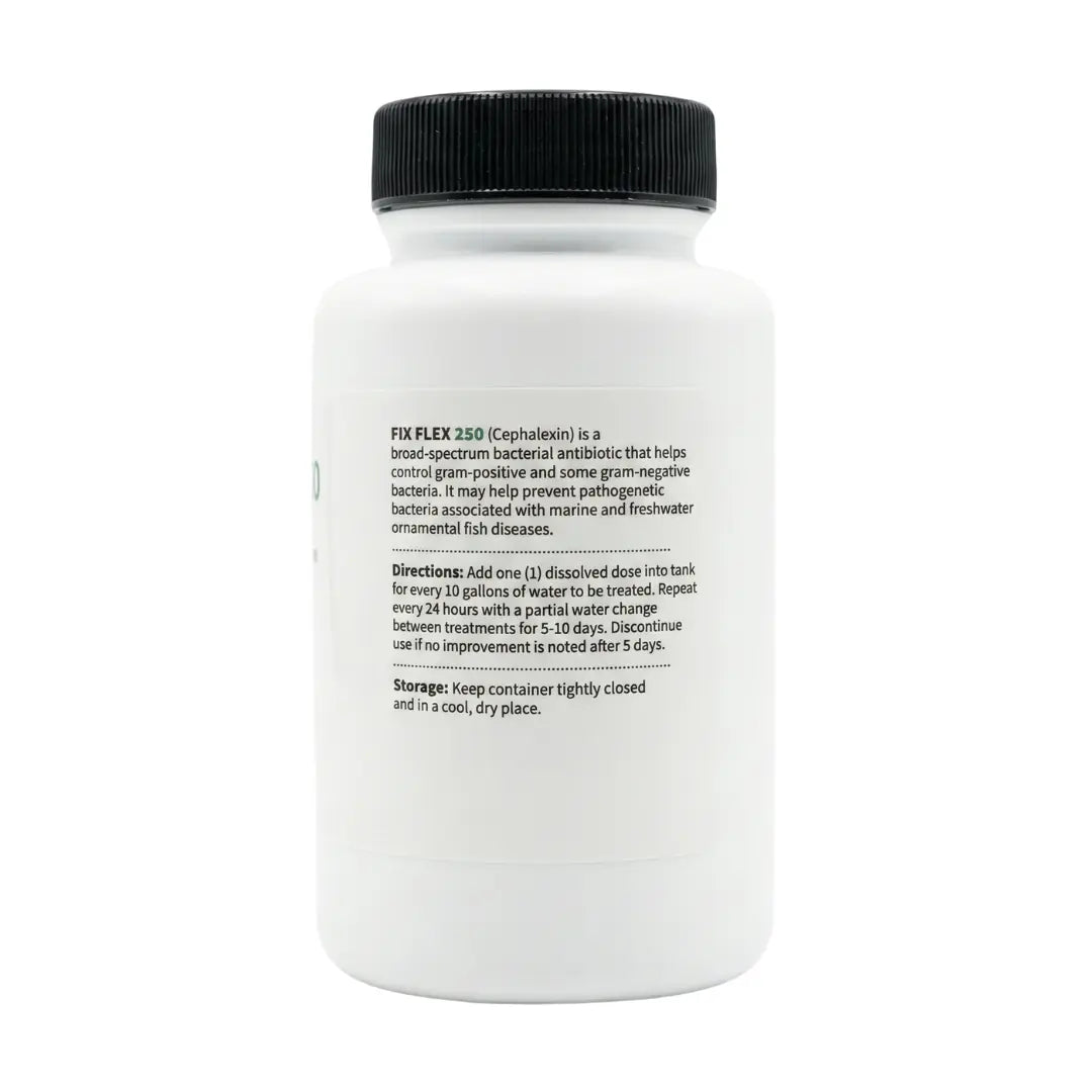 Fix Flex cephalexin capsules contain cephalexin monohydrate, an antibiotic commonly used by aquarists when fish show signs that are consistent with bacterial problems, such as fin and tail damage, skin sores or red patches. It is formulated and labeled for aquarium use, not as a substitute for prescriptions for humans or other pets.